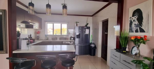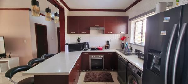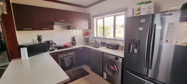 This modern apartment is located on the top floor.<br />It has 2 bedrooms with 2 bathrooms. The main bedroom has a full bathroom en-suite with tub and shower and the second family bathroom has a shower.<br />The apartment has a large kitchen with oven, hob and extractor as well as double basin, space for a double door fridge and under-counter appliances. It has techni-stone counter tops with a breakfast nook.<br />The apartment has a large open plan living area which leads out to a covered patio.<br />The passage is spacious and has a fitted study area.<br />The complex has 24 hour access control security and a clubhouse area with pool and braai area.<br />