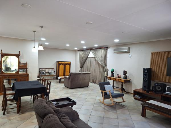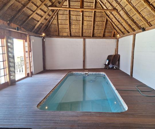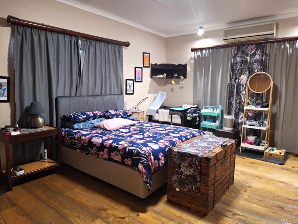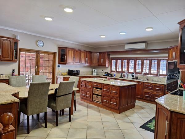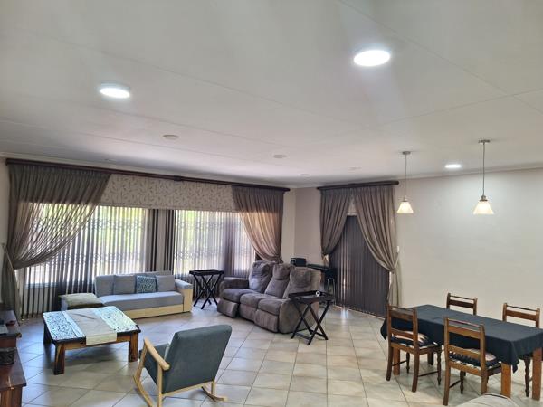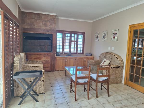 4 BEDROOM HOUSE WITH FLATLETT<br />This well equipped house has all the necessary fittings : solar system, battery power and water tanks. Also security systems like alarm, security gates at front door and windows, gate in hallway. Burglar bars at all the windows.<br />Furthermore a dream man-cave double garage to fit 4 vehicles as well as a spacious workshop area with built-in cupboards, walk-inn closet and entrance to main house.<br />For the woman of the house an immaculate and spacious kitchen with solid rose wood cupboards with marble tops,, working island, eye level built-in oven, and separate scullery with its own built-in cupboards. Downstairs a<br />laundry with laundry basin, built-in shelves and separate bathroom with shower, basin and toilet.<br />For the entertainer- a built-in braai area leading with double wooden doors to either the dining area or to the wooden deck with its lively view. Furthermore a indoor swimming pool with its own entertainment area, built-in braai and fitted bar.<br />