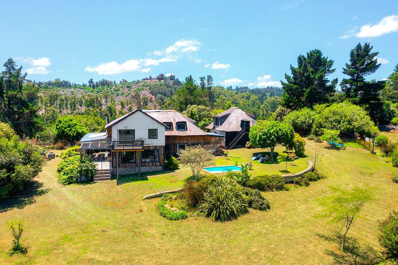 This extraordinary 25-hectare agricultural smallholding, offers a completely private world of unique character just 12km from Sedgefield. Set high on the hillside, the farm commands sweeping, uninterrupted views over the Swartvlei Estuary and the sprawling mountain landscape.The main residence is set apart by its stunning aesthetic, thanks to the main roof having been recently re-thatched, a feature that immediately sets the tone for rustic elegance. A newly redone thatch roof not only adds charm but provides excellent natural insulation, helping keep the home cooler in summer and warmer in winter. The grand entrance hall, graced by a stylish staircase, leads to spacious, light-filled living areas. These include a generous lounge which captures the magnificent views and flows seamlessly to a sparkling swimming pool. For cooler evenings, the family room centers around a wood-burning fireplace, providing a cozy heart for the home.Accommodation includes three spacious bedrooms and three bathrooms, with a private ensuite on the ground floor for ease of access and two bedrooms resting upstairs. The charming farm-style kitchen, featuring an open-plan dining area and a separate working scullerylaundry, opens onto a generous, north-facing verandahan ideal spot for entertaining or soaking in the views.<br />The property is comprehensively equipped for dual living, income, and equestrian pursuits. A complex converted from a double garage offers a ground-floor workspace and a charming upstairs open-plan flatlet with its own entrance and bathroom, ideal for guests or rental income. Infrastructure is anchored by a substantial split-level shed with dual access, which includes comfortable two-bedroom staff quarters.<br />The two stables and lunging ring invite equestrian enthusiasts, while a nearby two-room office the former stables with a bathroom can easily be reimagined into a cozy cottage.Practicality is ensured by robust water security, featuring a borehole, a natural dirt dam, and a 126,000L underground rainwater reservoir. Complete with 3-phase power, underfloor heating, and dual entrances, this sanctuary offers a rare, fully equipped opportunity to own a bespoke lifestyle farm.<br />
