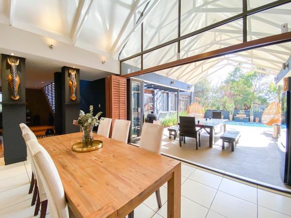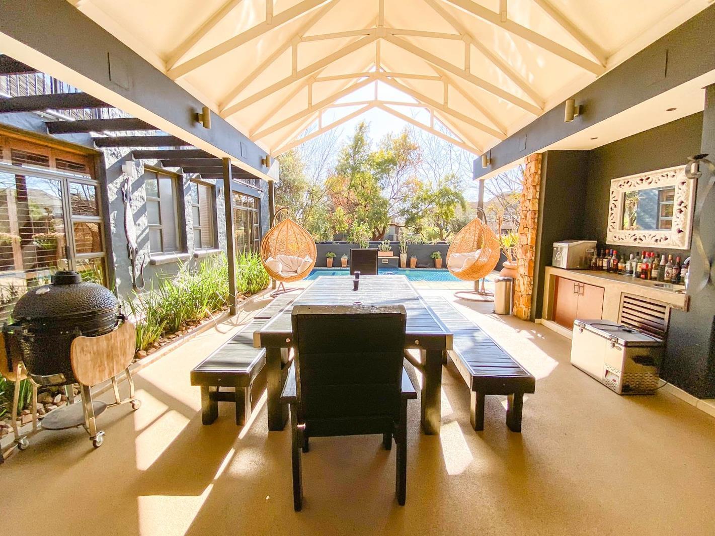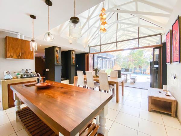 Entertain family and guests with a gas braai nestled under high beamed ceilings, complemented by a pool and bar area, all surrounded by manicured gardens and an assortment of seating areas, including a boma for unforgettable evenings under the stars.