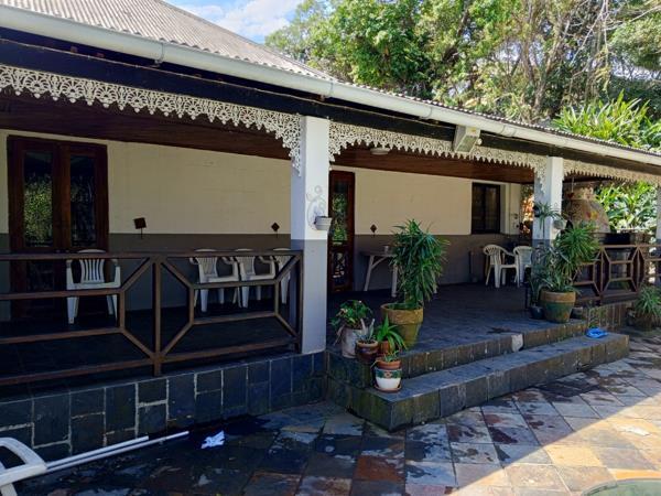 Experience the charm of this spacious colonial-style home, set within a lush tropical garden. Enter through custom wrought iron gates and be welcomed by serene greenery, a paved driveway, and a double carport. The home features a grand lounge with soaring ceilings, cement floors, and a fireplace, alongside a dining room with timeless wooden flooring. The main bedroom offers a newly tiled en-suite bathroom and large dressing room, while six additional bedrooms each bring their own character. Two full family bathrooms complement the home, including one with a ball-and-claw bath and another with Moroccan-inspired finishes.