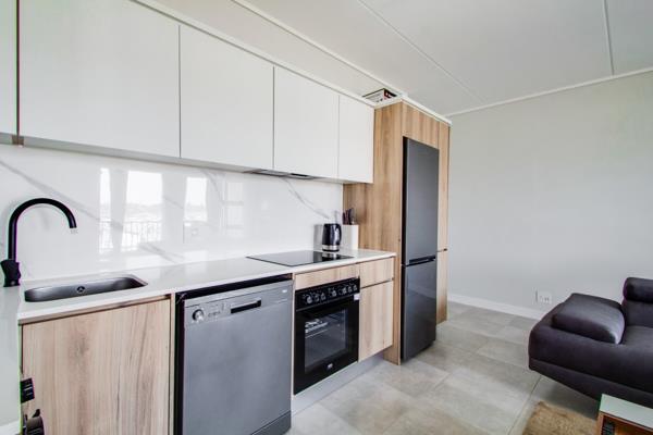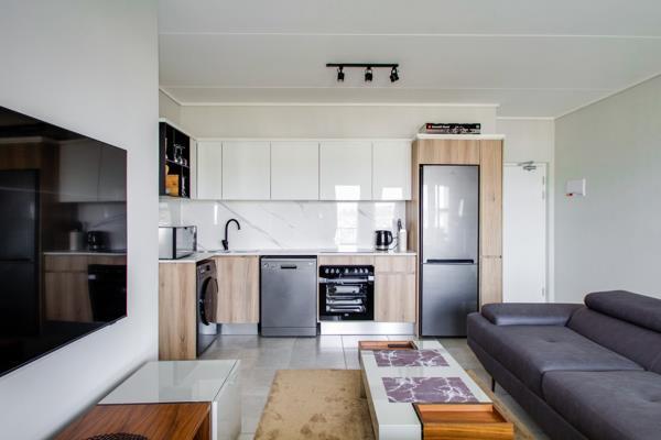 The contemporary kitchen is a statement of both style and functionality, featuring premium Technistone countertops and fitted with high-end, energy-efficient appliances, including a refrigeratorfreezer, washing machine, and dishwasher. The open-plan living and dining area extends effortlessly onto a private, covered balcony, providing a tranquil setting for relaxation or refined entertaining.