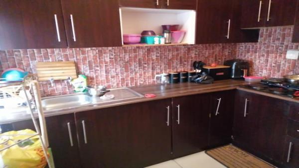 The kitchen is equipped with dark wood-look cabinetry, coordinating countertops, and a distinctive brick-patterned backsplash, offering ample storage and a practical workspace. It includes a standalone stove and a double basin sink. While currently lived-in, this space is ready for a refresh to unlock its full potential.