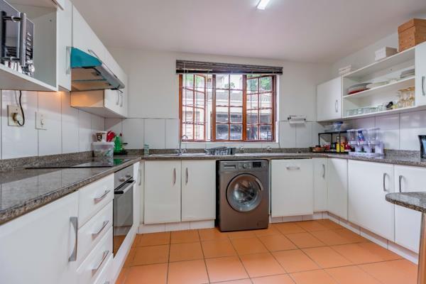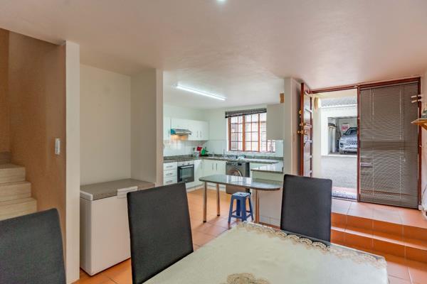 The tiled lounge and dining area, adorned with high ceilings, seamlessly connect to the spacious garden, creating a harmonious indoor-outdoor flow for your enjoyment. As you ascend the staircase, you''ll discover three bedrooms, each adorned with beautiful laminated flooring that adds warmth and sophistication to the living spaces.