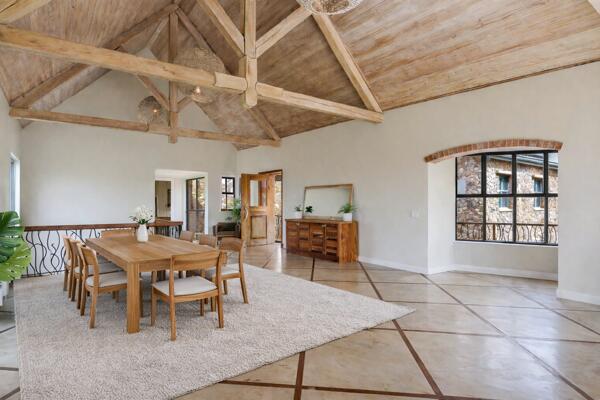 This masterpiece of design is set within over 3,600m2 of exquisitely landscaped gardens, this exceptional 689m2 contemporary farmhouse offers a rare blend of countryside serenity and refined estate living. Rolling lawns unfold around a tranquil pond and dam, while a sparkling pool and jacuzzi create a private retreat designed for both quiet reflection and effortless entertaining. The home itself is warm and expansive, with open-beam ceilings, generous proportions and large picture windows that draw in natural light and frame uninterrupted 180 views from the elevated verandaan ever-changing canvas of greenery and sky.