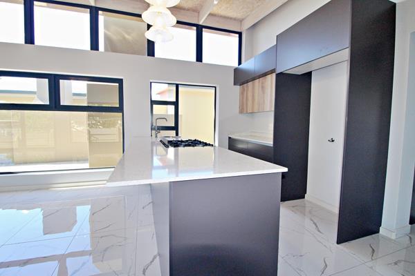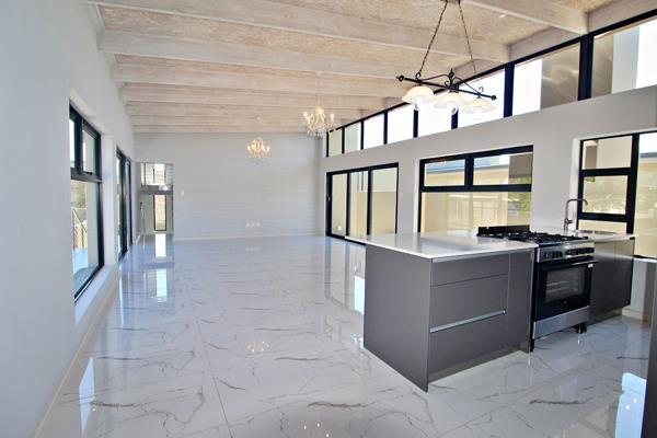 The spacious open-plan lounge and dining area feature large windows and sliding doors, allowing natural light to flood the space and offering access to the outdoor entertainment area. The sleek, modern kitchen boasts high-end finishes and includes a separate scullery for added convenience.
