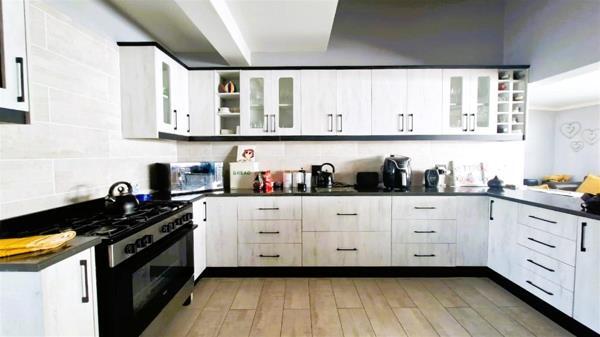 The an open-plan design and high-volume ceilings with exposed wood beams create airy elegance. The modern kitchen offers ample cupboards, a breakfast nook counter, scullery, and seamless flow to the dininglounge areacomplete with an indoor built-in braai and stacker patio doors opening to a paved outdoor garden space. Direct access to the XL single garage keeps everything practical.