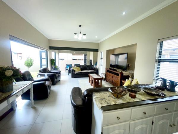 The open-plan living and dining areas flow seamlessly from the contemporary kitchen to the covered patio, creating a welcoming space for entertaining and everyday living. with a scullery.