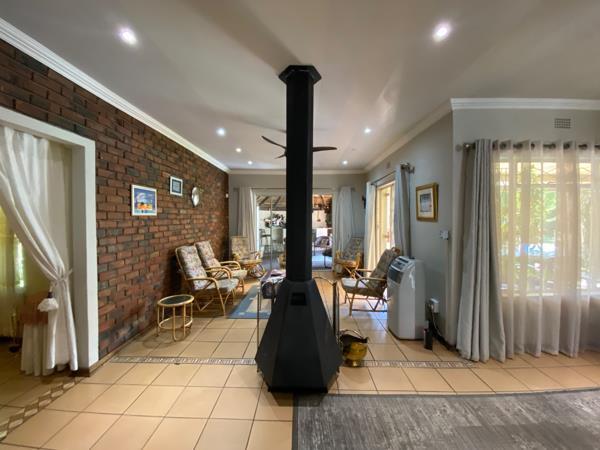 A charming thatched-roof entrance hall welcomes you into the home, creating a warm first impression. The spacious living areas flow effortlessly to the outdoor entertainment space, where a thatched braai and entertainment area overlooks the swimming pool and large, well-established garden perfect for family gatherings and relaxed outdoor living.