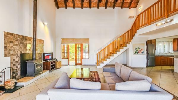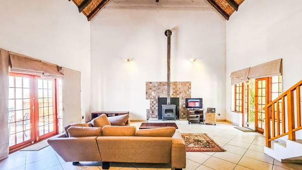 The generous open-plan living area features striking double-volume open-truss ceilings, creating a cool and airy atmosphere during the summer months, while a combustion fireplace provides warmth and comfort in winter.