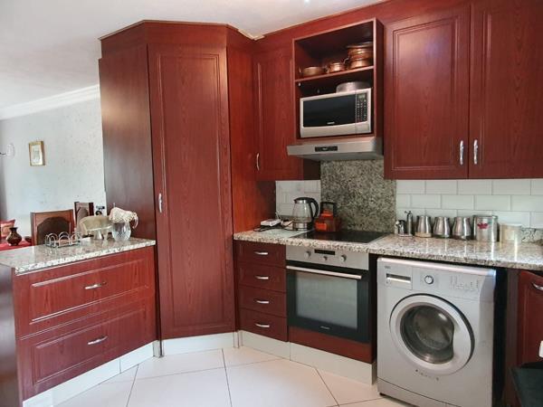 This well-maintained apartment features an open-plan living area with large windows that allow for sufficient sunlight, and flow out to the balcony, overlooking the beautifully maintained gardens. The kitchen is fitted with beautiful built-in cupboards and lovely marble countertops, porcelain tiles, a pantry, a double basin, and space for two undercounter appliances. Two spacious bedrooms, both fitted with laminated flooring, provide a warm and comfortable living environment. The bedrooms have ample cupboard space, with the 2nd bedroom''s cupboards having sliding doors - a great space saver solution. The bathroom offers a large shower, toilet, and a modern basin and cabinet.
