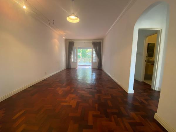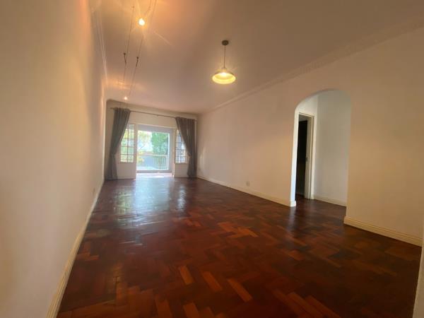 This apartment offers a spacious open-plan living and dining area, complemented by parquet flooring throughout and large bay windows that allow for excellent natural light. The kitchen is functional and well-positioned within the living space.