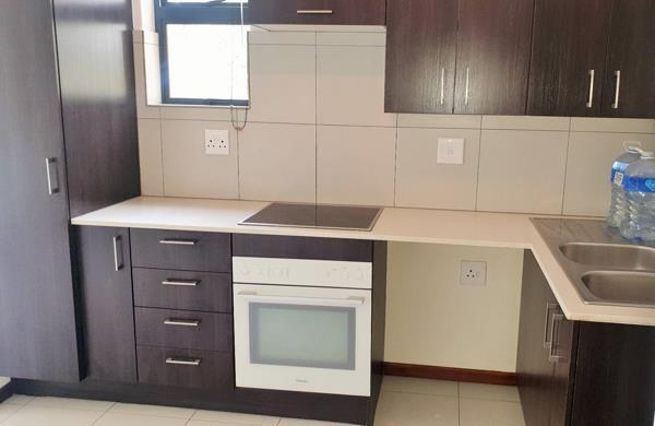 The kitchen is a functional balance between comfort and convenience and open to the living space. Countertops and breakfast counter are made of white stone. Space for one under-counter appliances and fridge. There is a tall pantry cupboard with shelves for groceries.