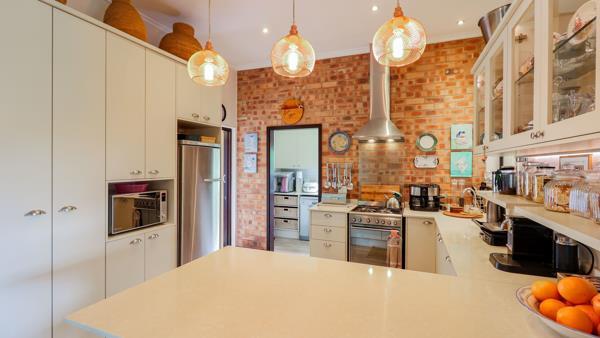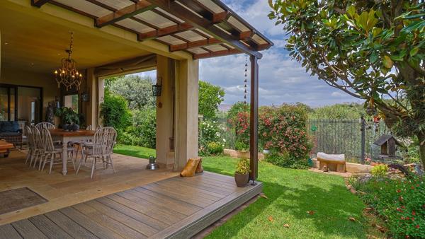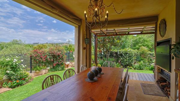 The heart of this home is the open-plan kitchen, which features elegant Caesar-stone countertops, a top-of-the-line SMEG 4-plate gas hob, and an electric oven, and separate scullery, ideal for those who love to cook and entertain. The kitchen flows effortlessly into the spacious dining and lounge areas, creating a seamless connection to the outdoors. From here, large sliding doors open to a stunning patio with a built-in braai, weatherproof blinds, and natural stone paving, offering the perfect space for dining and relaxation in any weather.