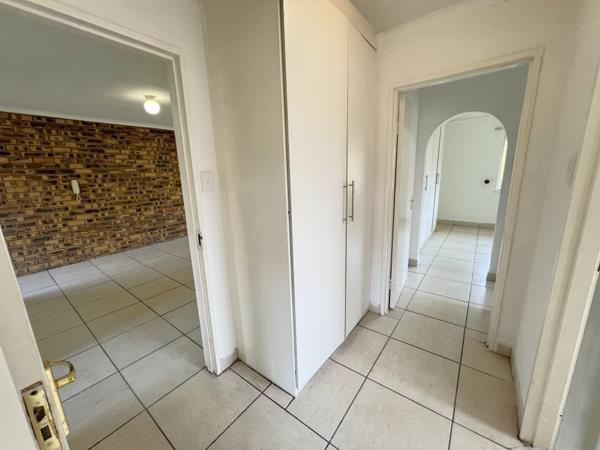 The unit offers a spacious open-plan living area with a well-sized kitchen that flows seamlessly into the lounge. The apartment features tiled flooring throughout, complemented by a stylish face-brick feature wall that adds character to the living space.