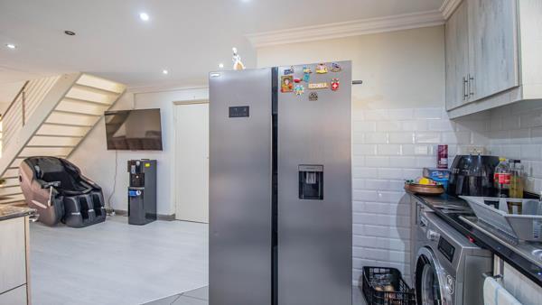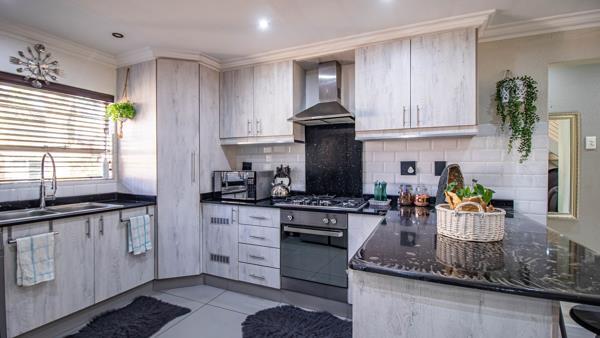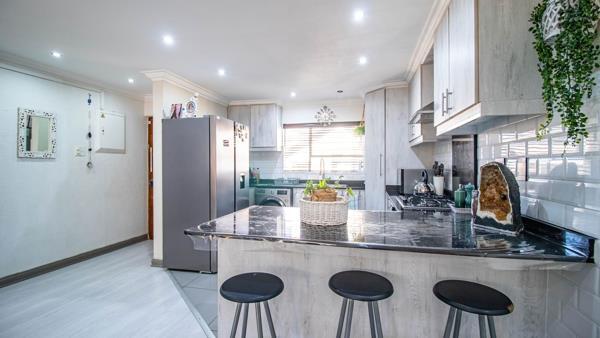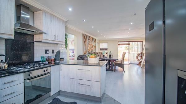 The well-sized modern open-plan kitchen features a gas hob, electric oven, Caesarstone countertops, ample cabinetry, space for water appliances, and accommodation for a double-door fridge. The spacious living area seamlessly extends to a covered patio, wrap-around garden, and built-in braaiperfect for relaxed entertaining and family living.