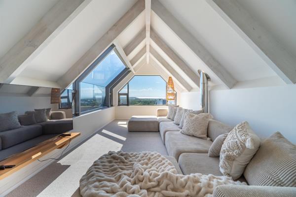 The upper level provides a private sanctuary within the home. Here, an additional lounge framed by dramatic windows captures sweeping 270-degree views across the estate and coastline. The spacious third bedroom opens to its own private terrace, creating a peaceful elevated retreat designed for relaxation and contemplation.