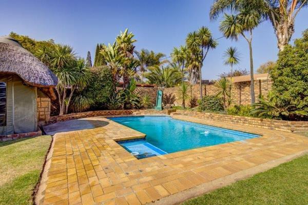 the lounge. For entertainment there is a large thatch lapa with built-in braai and side canvas to close during the winter days. Sparkling heated pool hidden in the garden. Large double garage with automated doors and a separate workshop. Carports for about 3 vehicles and a caravan. For comfort and peace of mind, this house is fitted with a 16KVA diesel generator that switches on automatically whenever there is