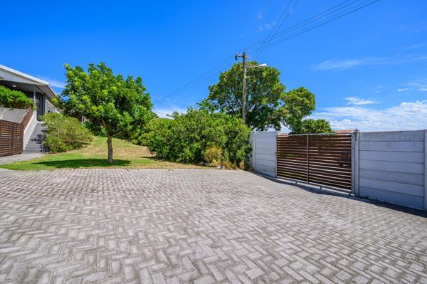 Outdoor living is a highlight, with a spacious covered patio perfect for entertaining or enjoying the South African climate. The property features extensive paving, including a large herringbone-patterned driveway that provides ample off-street parking for up to four vehicles. The established garden, though sloped in parts, offers mature trees and greenery, creating a tranquil environment. Distant town and city views, with a possible sea glimpse, can be enjoyed from elevated points.