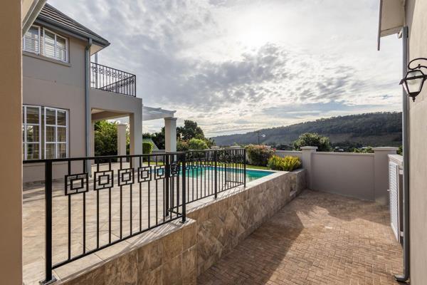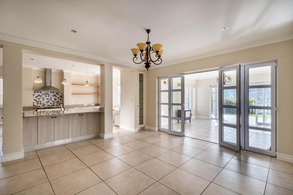 The open-plan kitchen features granite countertops, a SMEG gas stove, breakfast nook, walk-in pantry, and a scullery that opens to the courtyard and garden. The living and dining areas flow into a bright entertainment space with a cozy indoor fireplace, leading out to a built-in braai and heated pool perfect for gatherings.