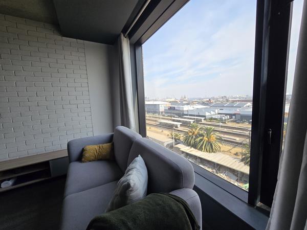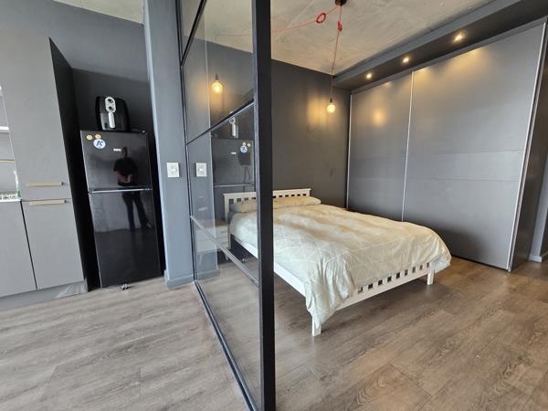 The studio features a clever layout, with the bedroom area separated by a stylish glass partition from the living space. The modern bathroom is fitted with a shower, basin and toilet, while the open-plan kitchen includes a built-in stove and oven and a plumbing point for a washing machine or dishwasher.