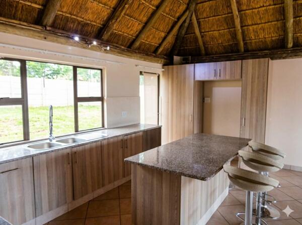 Discover this charming 125 sqm rental property in the serene Rynfield AH, Benoni, offering a distinctive blend of modern comfort and country living. This inviting home features a unique thatched roof and an open-plan layout, creating a warm and spacious atmosphere. The contemporary kitchen is well-appointed with modern light wood-look cabinetry, granite countertops, a practical island with seating, and a double sink. Large sliding glass doors and multiple windows ensure abundant natural light, enhancing indoor-outdoor flow.