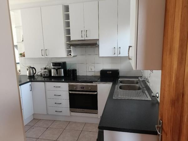 Enter into a tiled lounge which is open plan to the kitchen with white cupboards and granite counter tops. There is a under counter oven and extractor fan, a breakfast counter and space for a washing machine.
