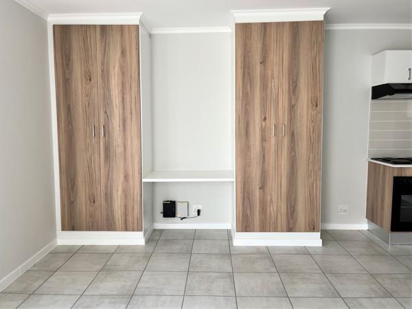 This super duper south-west facing bachelor apartment offers perfect lock up and go convenience. Front door welcomes you into this spacious studio apartment with open plan kitchen area sporting built in cupboards, Caesar-stone counter tops, Defy 600 extractor fan, countertop hob, under counter oven plus space for fridge and under counter washing machine. Living area presents 2 built in cupboards on either side of a counter and picture windows with an amazing view of the sun setting in the west. Separate bathroom completes this great ensemble with a large glass encased shower, wall hung basin, toilet and decent sized medicine cabinet.