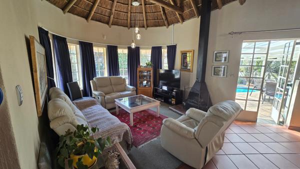 Situated in the leafy, sought-after suburb of Randpark Ridge, close to both the primary and high schools, this beautiful home is an entertainer's dream. Thatched with gorgeous, high ceilings keep it cool in summer a central fireplace warms the whole home in winter. The open-plan kitchen with separate scullery & laundry flows into the downstairs lounge and dining room, which opens onto a large covered patio perfect for large gatherings. Paved courtyard with entrance & exit gates makes maintenance a breeze and provides ample parking for extra cars, caravans or boats. Walking distance to shops and local park. 2 large Wendy houses perfect for a work-from-home office or storage room. All bedrooms well-sized. Fourth bedroom upstairs is large with its own private covered balcony. Downstairs guest loo accessible from either outside or inside the house.