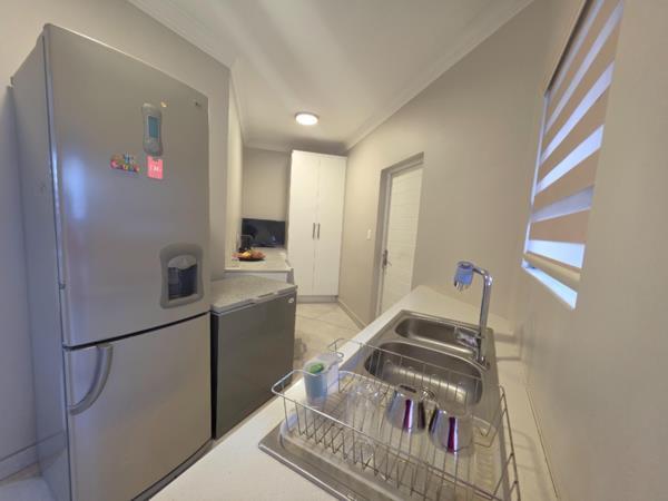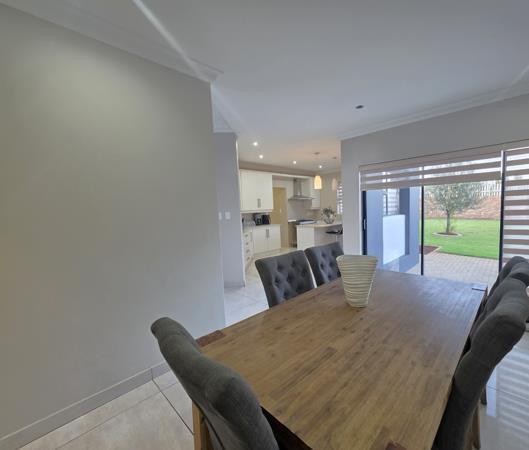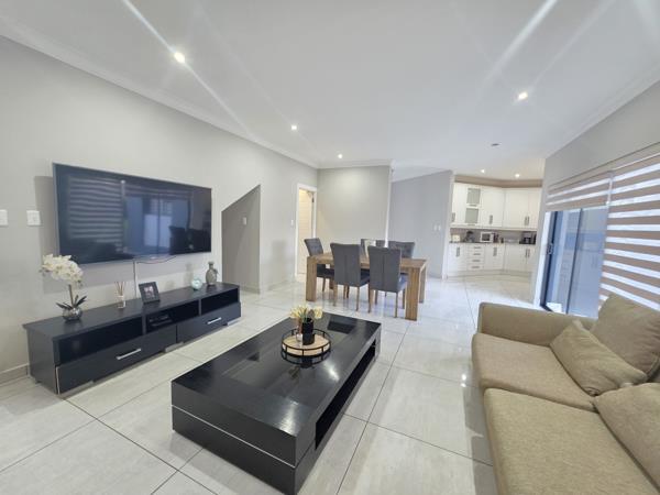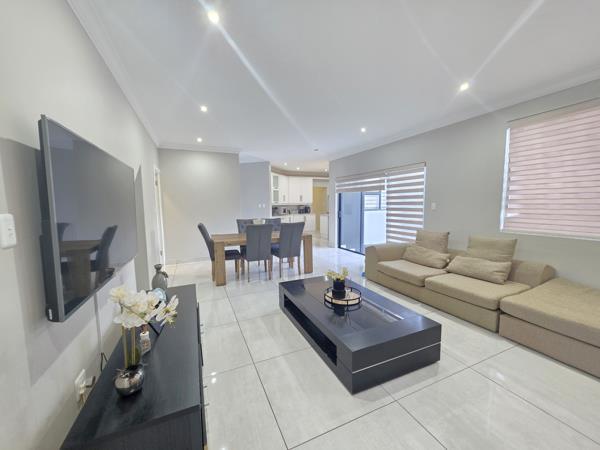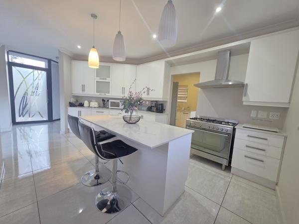 Downstairs, the home opens into a modern layout with a sleek kitchen fitted with a gas stove, centre island, and a separate scullery with space for your appliances. The lounge and dining area flow seamlessly, creating a warm and inviting living space. A conveniently located guest toilet adds to the comfort and practicality of the home.