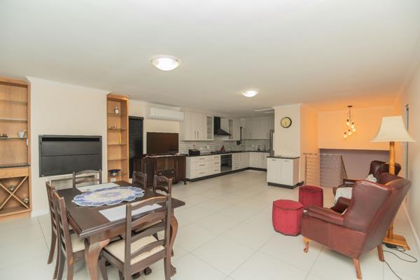 The upper-level living area sits above the inter-leading double garage and enjoys a prime elevated position at the back of the hill, offering views across the complex through a large sliding window fitted with Louvre shutters. The living space is tiled throughout and includes air-conditioning, a built-in braai, and seamless open-plan flow into the modern kitchen.