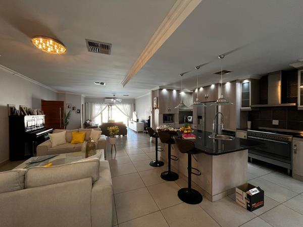 Step inside to discover an open-plan living environment where contemporary design meets functional elegance. The heart of the home features a state-of-the-art kitchen, complete with a large central island, integrated appliances, and sleek countertops, seamlessly flowing into the dining and lounge areas. A stylish brick-feature fireplace adds warmth and character, while ample natural light floods the space, enhanced by modern lighting fixtures and consistent tiled flooring throughout. Air conditioning ensures year-round comfort.