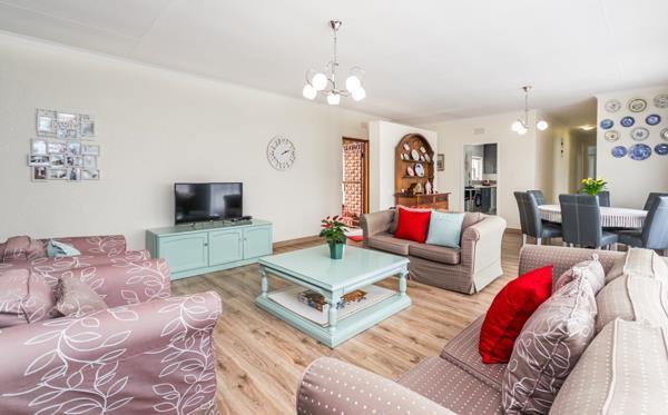 Step into a light-filled, open-plan lounge and dining area featuring a striking face brick feature wall and seamless flow to the garden. The home offers a warm yet modern feel, ideal for both family living and entertaining.