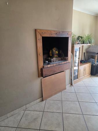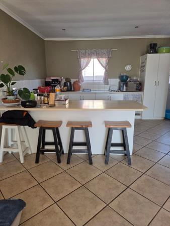 The kitchen is equipped with light-colored tiled flooring, ample white cabinetry, and a practical breakfast bar with seating, perfect for casual meals and daily living. An indoor braai area provides an ideal space for entertaining guests, adding to the home''s appeal.