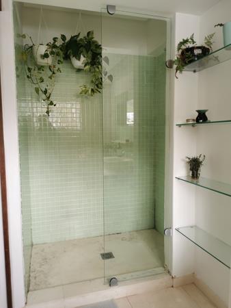 Bathroom: The bathroom features a spacious walk-in shower.