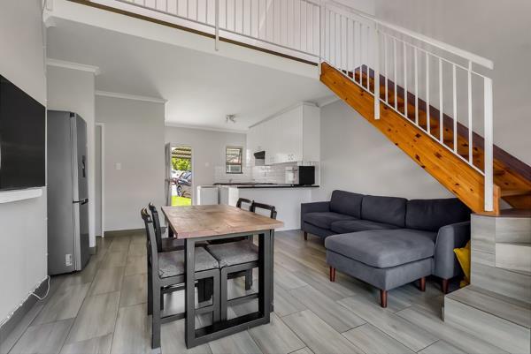 Upstairs, a versatile tiled loft provides the perfect space for a second lounge, home office, or creative retreat, and also houses the value-adding solar inverter. This area opens onto a well-sized balcony, providing a private outdoor space with scenic views. The home offers two bright and airy bedrooms. The first bedroom, featuring built-in cupboards and a large window, is serviced by a full guest bathroom. The main bedroom comfortably accommodates a king-sized bed, includes ample built-in cupboards, and boasts an en-suite bathroom with a toilet, basin, and shower.