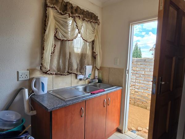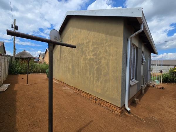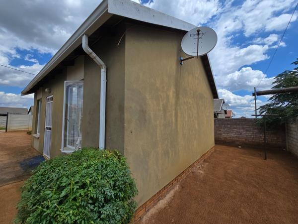 The lounge area is a functional space, benefiting from natural light. The kitchen is equipped with a double sink, countertop, and base cabinets, providing essential amenities and direct outdoor access. The two bedrooms are practical, each featuring tiled floors and natural light, while the single bathroom serves the home''s needs. Security is enhanced with burglar bars on windows and a security gate on the side of the house.