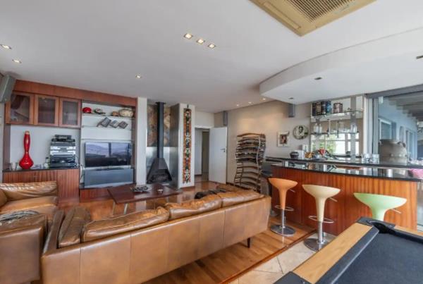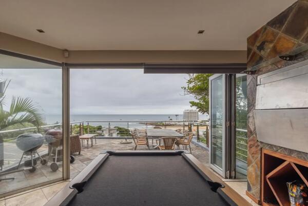 Master en-suite bedroom, two additional childrens bedrooms with a shared bathroom, and an expansive entertainment lounge with fireplace, bar area, full-sized pool table, and stacking doors opening onto a large patio.