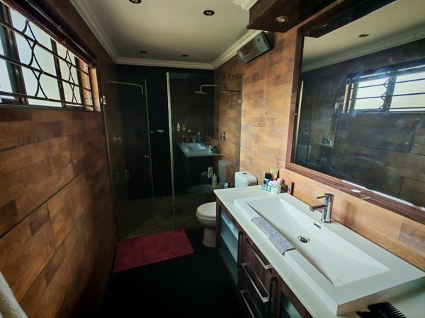 Accommodation includes three well-sized bedrooms with laminated flooring, built-in cupboards, and air-conditioners. The main bedroom boasts a private en-suite bathroom, while the second bathroom offers a luxurious jet bath and double vanity. A separate toilet adds extra convenience.