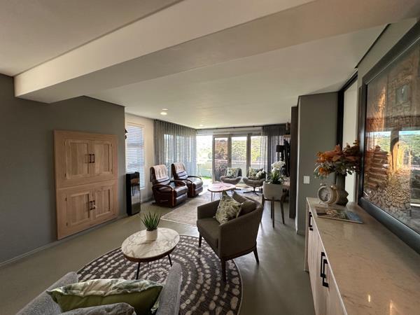 The open-plan lounge and dining area flows seamlessly into an indoor built-in braai, ideal for entertaining in all seasons. Stacking doors open onto a private balcony with lovely views, while large tinted windows flood the home with natural light.