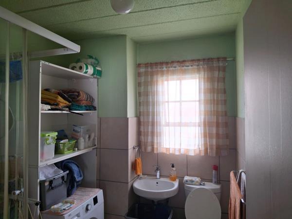 The property features two tiled bedrooms, both fitted with built-in cupboards, providing comfortable and functional private spaces. The bathroom is neat and well-designed, offering a shower as well as dedicated space for a washing machine, adding to the practicality of the home.