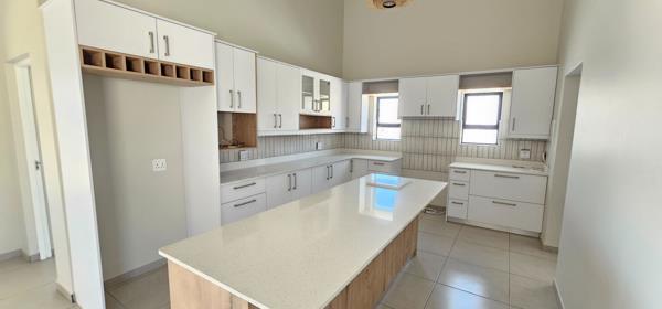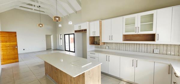 The light-filled open-plan living area boasts exposed trusses, creating a wonderful sense of space and allowing natural light to flow throughout. The modern kitchen is finished with stylish white cupboards and elegant two-tone white and wood accents, complemented by engineered stone countertops. A separate scullery provides direct access to the double garage, which features a motorised garage door for added convenience.