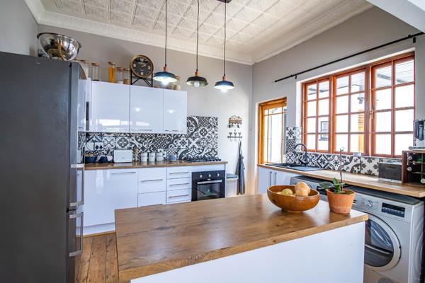 Inside, discover a delightful blend of character and modern comfort. Original hardwood floors flow throughout, complemented by unique pressed tin ceilings that add a touch of vintage charm. The open-plan living, dining, and kitchen areas create a wonderful, airy feel, perfect for everyday life and entertaining. The kitchen is a real highlight, featuring sleek white cabinetry, warm wooden countertops, a stylish patterned backsplash, and even integrated laundry appliances for convenience.