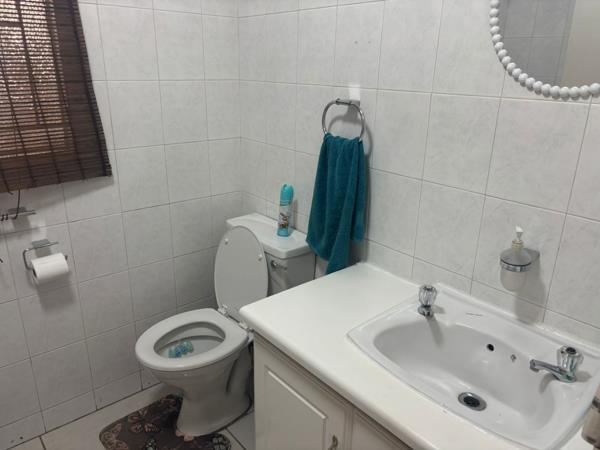 Comprising two well-proportioned bedrooms, each features neutral wall tones and natural light from security-barred windows, offering comfortable retreats. The single, fully tiled bathroom presents a clean aesthetic, including a vanity with a sink, a toilet, and a window for ventilation.
