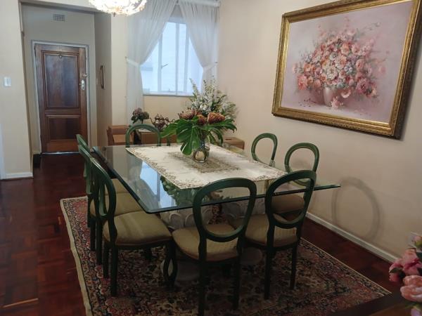 The generously sized kitchen has ample cabinetry, granite surfaces, and room for all essential appliances, plus a large separate pantry. The layout seamlessly connects the dining area to the living room, extending to a balcony that overlooks the beautifully maintained communal gardens and swimming pool.