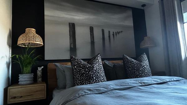 The Second bedroom features a Queen Vancouver Acacia wood bed with a solid oak floating side table.