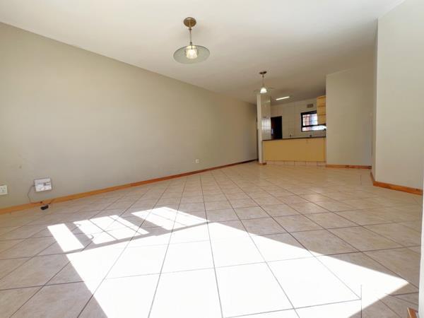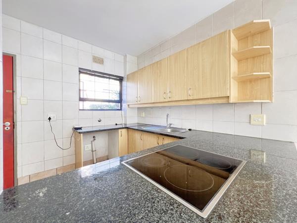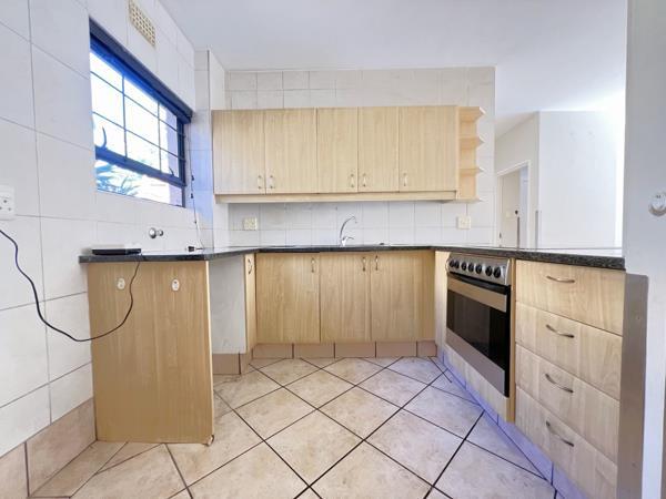 The apartment offers a spacious, light-filled open-plan living area that flows seamlessly into a modern kitchen fitted with granite countertops, ample cupboard space, and a Defy oven and stove. The kitchen also provides space for one under-counter appliance and a fridge, combining practicality with a sleek, contemporary finish. The covered patio opens onto a lush, well-maintained communal garden, creating a peaceful space to relax or entertain.
