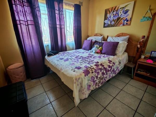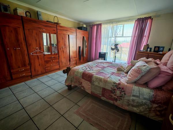 The home features four well-sized bedrooms, all fitted with built-in cupboards, and two bathrooms designed for everyday convenience. A large kitchen forms the heart of the home, complemented by a separate laundry room, while the spacious dining area and expansive lounge create a warm and inviting atmosphere. The lounge is enhanced by distinctive yellow glass windows, adding character and natural light.