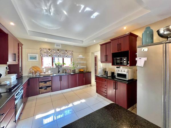 The kitchen has swanky granite tops and plenty of cupboards and is an easy kitchen in which to move around. A bonus is that, tucked discreetly out of sight is a good size scullery and a walk-in pantry that has a treli-door gate. The spotless house is a clutter-free modern design that offers one the opportunity to just keep life simple and move in and start living and enjoying one''s life. All the space offered is manageable and justified. There are 3 bedrooms on the one side of the home with a bathroom with a large showerloo and basin for the two smaller bedrooms and then the main bedroom is spacious and has a contemporary attractive renovated en-suite bathroom with a large modern shower and a beautiful oval to die for bathtub a double vanity basin loo..The main bedroom also has french doors that open onto the garden near the swimming pool. This front garden is neatly divided into a very neat and level lawned area framing a beautiful manageable aqua blue swimming pool. The layout and design of this home is ideal for no fuss modern executive style living with no immediate or hidden renovations that usually are required in older homes. This house has already been renovated over time to cater and adapt for the needs of raising a loving family over a 25 year period. There is also a 4th room as one enters this pretty home, that can either be used as a study or if required it be used as a guest bedroom as well because it offers its own en-suite shower loo and basin. To complete the package deal of this perfect home, is the tv lounge off of the main dining lounge area.