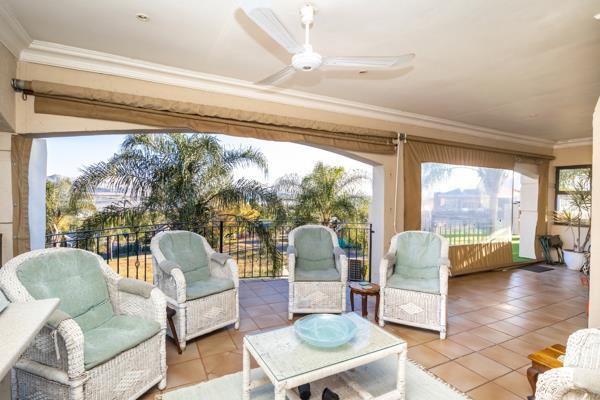 Comfort is assured with five air conditioners and ceiling fans throughout. Step outside to a lovely patio overlooking a landscaped garden, complete with a braai room and Jacuzzi, perfect for entertaining. Extras include awnings, special doors, generous storage, and staff quarters.